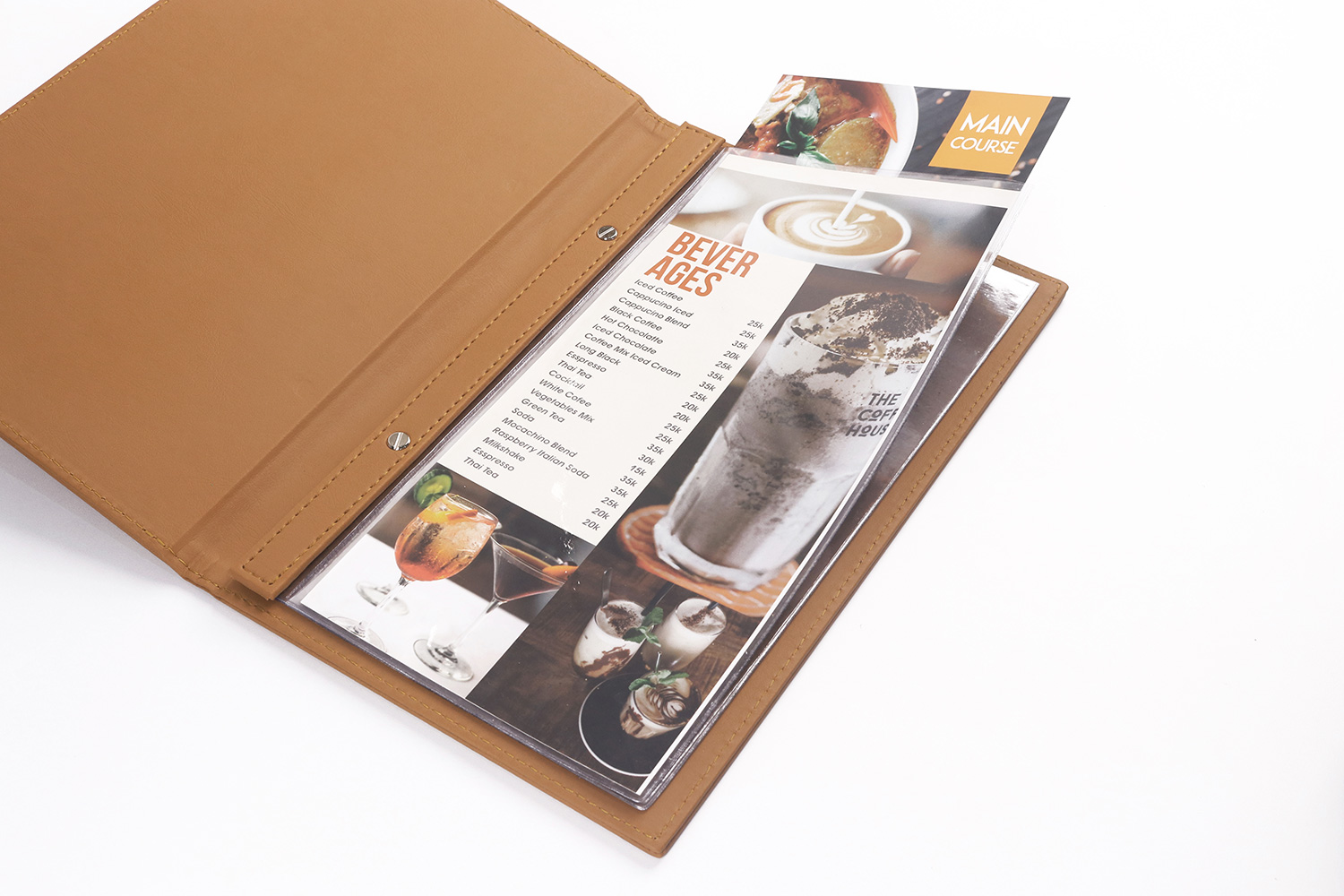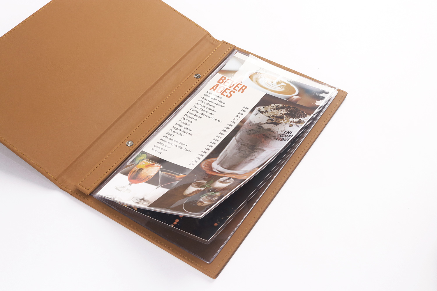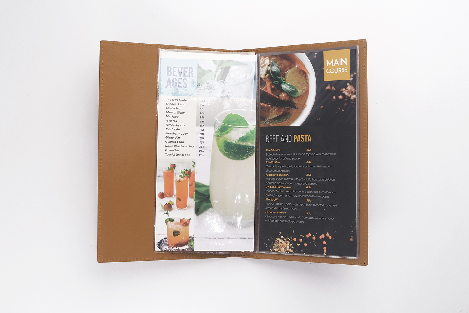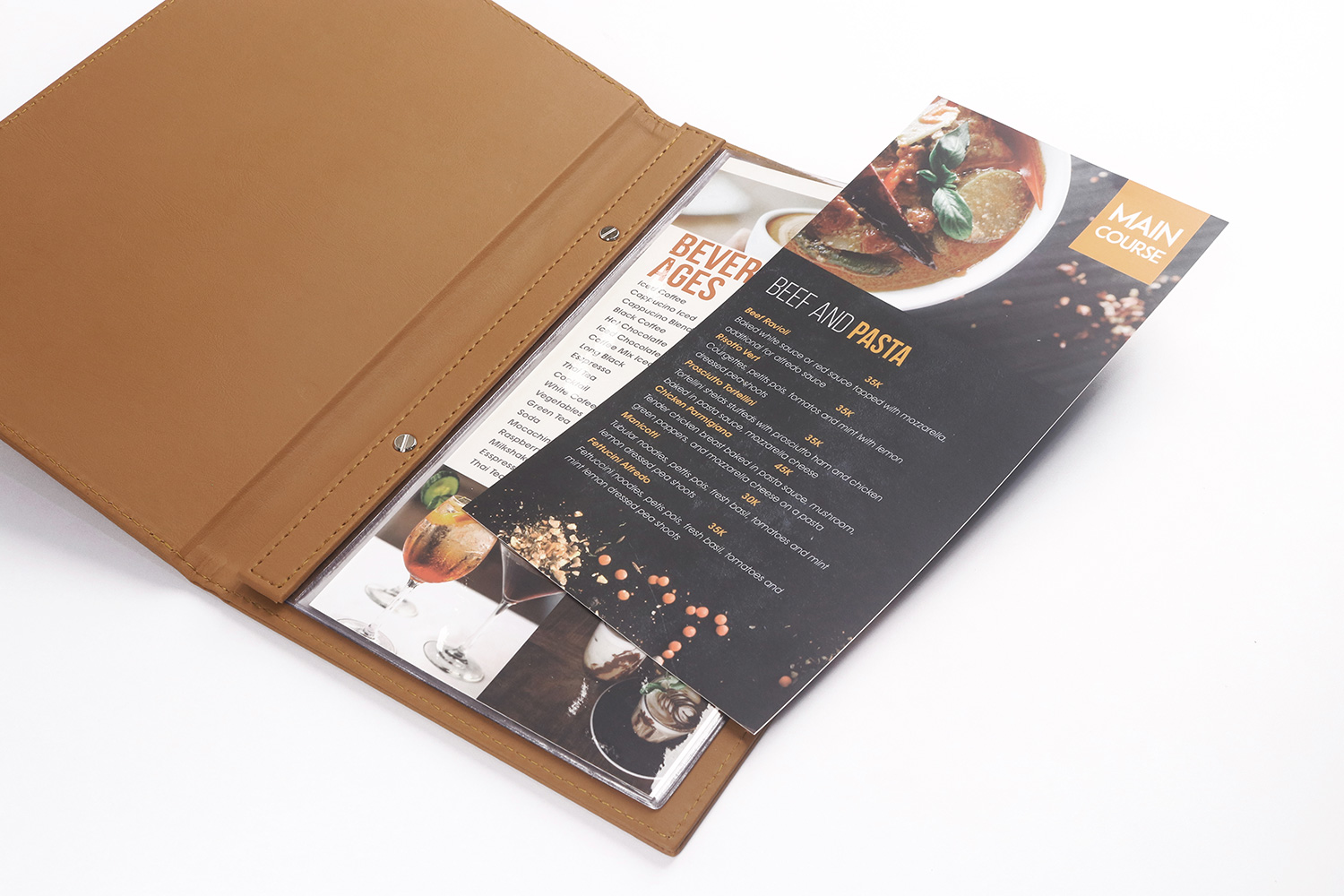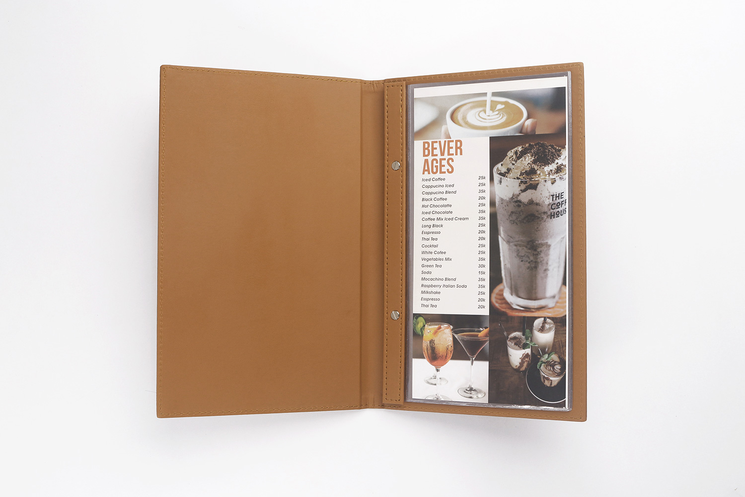dengan desain yang eksklusif dan material kulit yang tahan lama, menjadikan buku menu kulit ini sangat berkualitas.