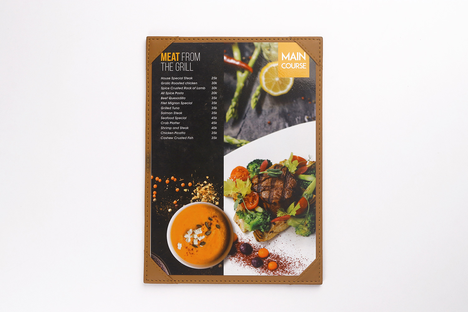 dengan desain yang eksklusif dan material kulit yang tahan lama, menjadikan buku menu kulit ini sangat berkualitas.